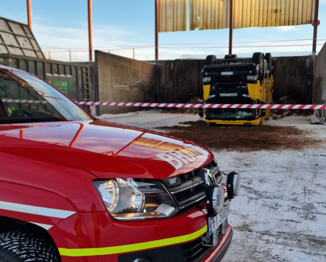 En renovasjonsbil som skulle tippe avfall rygget og havnet på taket hos Sirkula IKS utenfor Hamar mandag morgen. Foto: Karine Bogsti, Sirkula IKS.